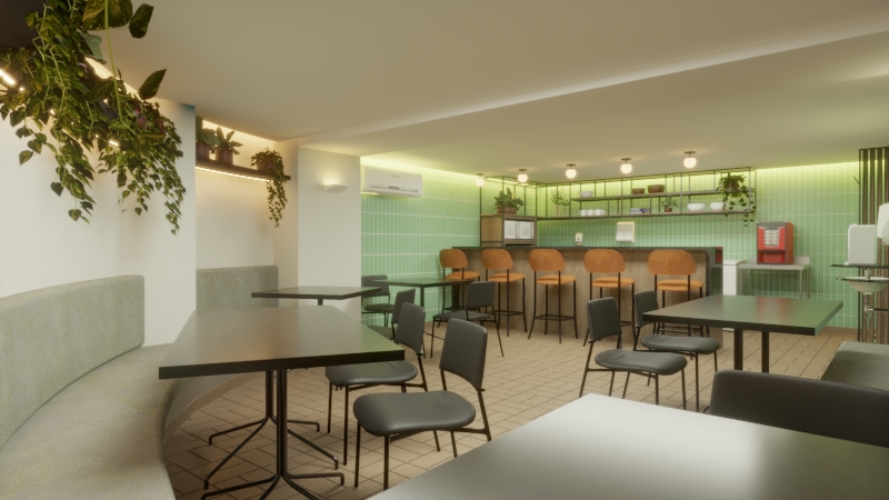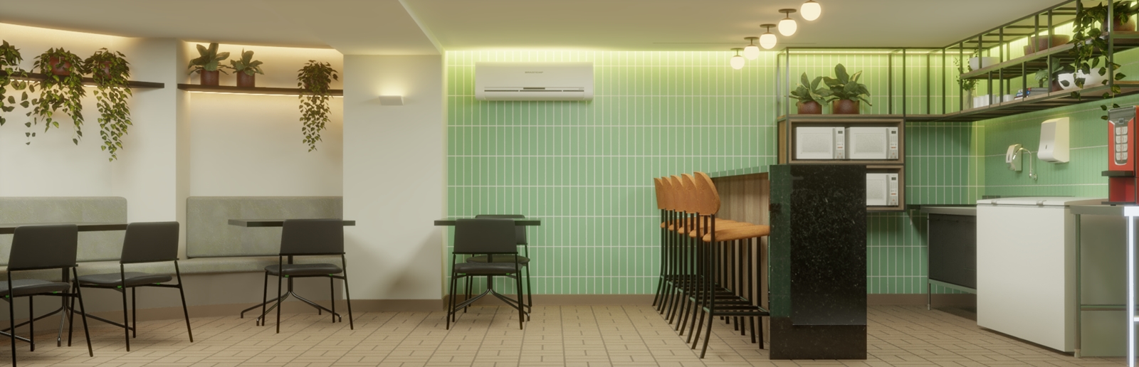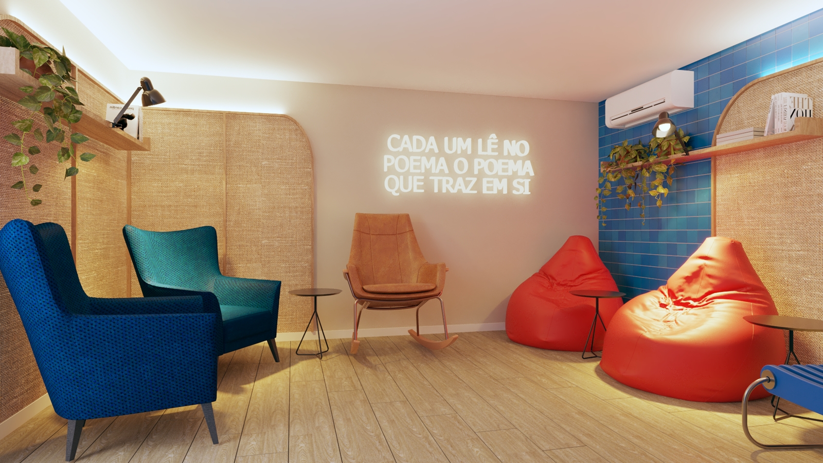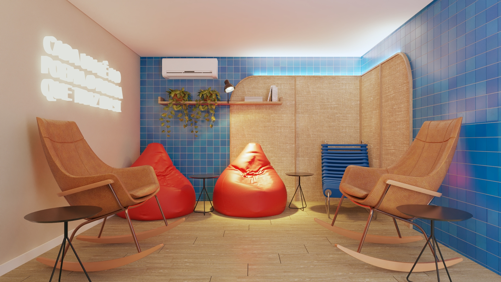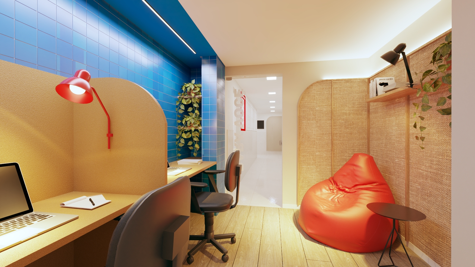 Entendendo a importância transformadora do design na vida das pessoas, este hotel optou não só por oferecê-lo para os hóspedes e coordenações, mas também para todos os funcionários em seus horários de alimentação e descanso. A área do refeitório foi pensada como um restaurante, explorando principalmente o conforto e a convivência. Nas salas de descanso e estudos, as cores rompem com a paleta existente em todas as demais áreas do hotel para de fato trazer um momento de desconexão com o trabalho e relaxamento. Em todos os espaços diferentes tipo de assentos abraçam os variados biotipos, respeitando a diversidade que compõem o quadro de funcionários deste hotel paulistano.