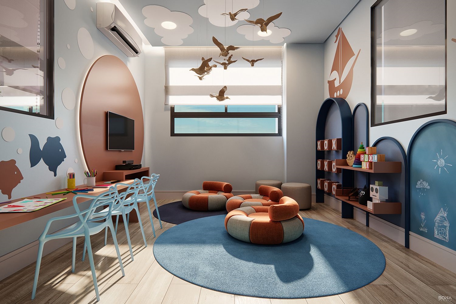 Boias, gaivotas, peixes e barcos compõem o cenário cuidadosamente pensado deste espaço lúdico, que captura a essência do universo marítimo para estimular a imaginação infantil. Apesar do espaço compacto, o projeto foi habilmente planejado para oferecer funcionalidade e aproveitamento máximo, criando um ambiente acolhedor e dinâmico. Cada det alhe foi concebido para despertar grandes aventuras e histórias inesquecíveis, unindo diversão, segurança e criatividade. Um lugar onde as crianças podem criar memórias especiais enquanto exploram um mundo inspirado pela magia do mar.