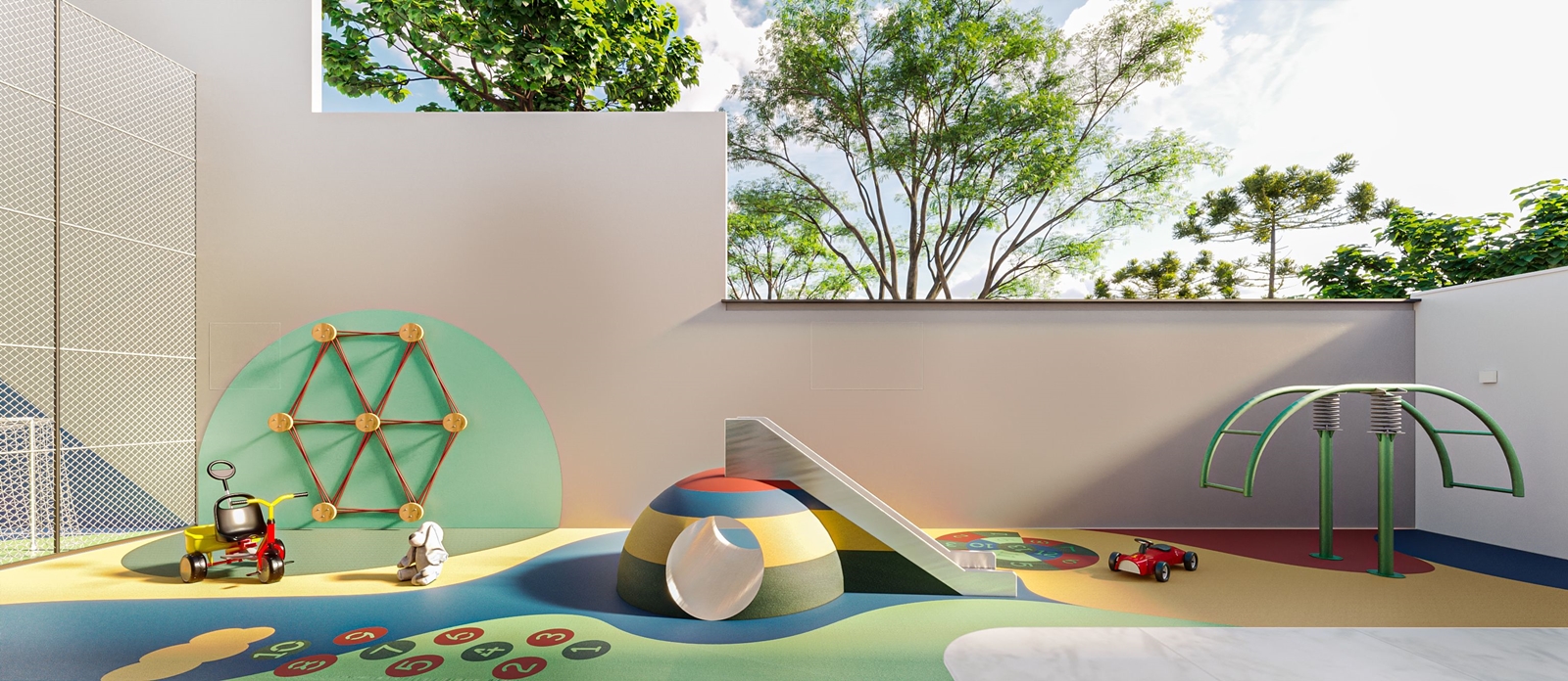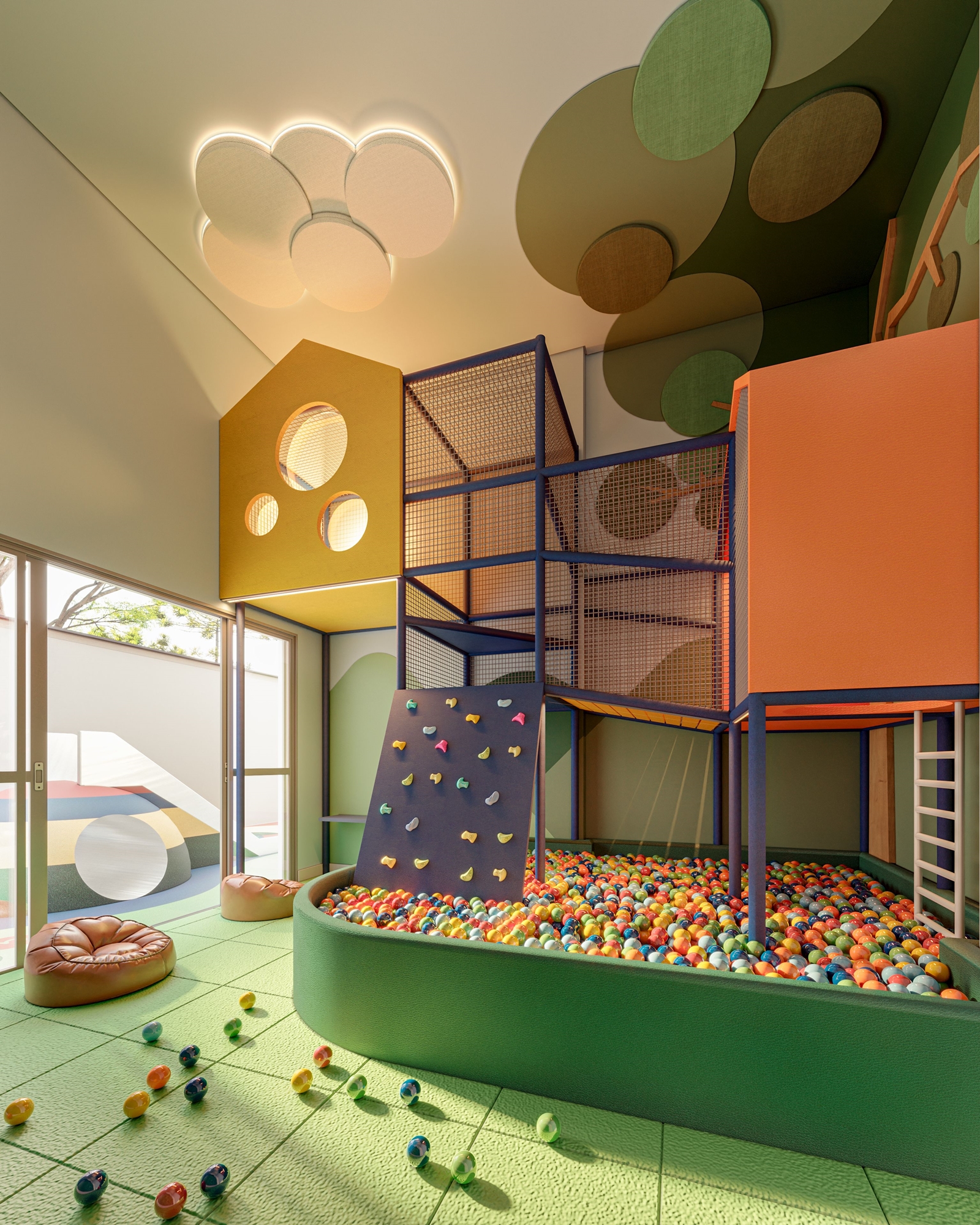 Inspirado no conceito de casa na árvore, este espaço kids utiliza um pé- direito elevado, com mais de 5 metros, para criar um ambiente lúdico e envolvente. O projeto inclui estruturas de escalada e um circuito dinâmico formado por casinhas suspensas e uma ampla piscina de bolinhas, promovendo interação e diversão. A integração com o playground externo amplia o ambiente em um grande univer so de brincadeiras e aventuras.